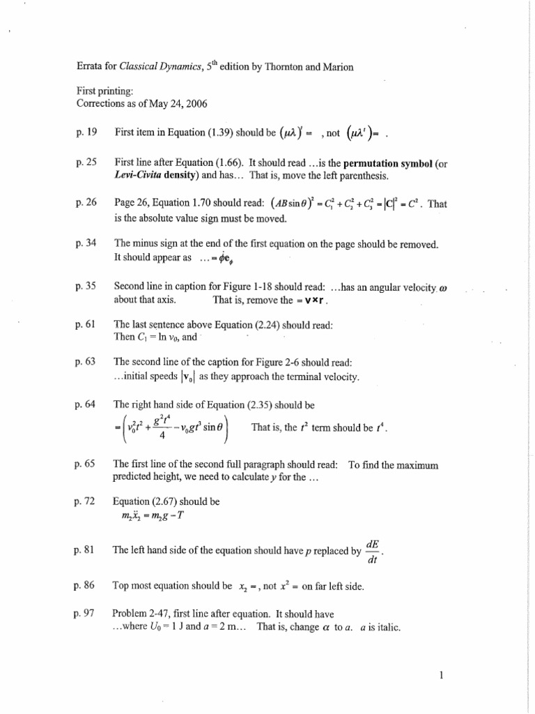 Errata for Classical Dynamics, 5“ edition by Thornton and Marion. First printing: Corrections as of May 24, 2006 p19 p.25 p.26 p34 p.35 p.61 p. 63 p.64 p.65 p72 p.81 p. 86 p.97 First item in Equation (1.39) should be (uA) = not (uA')= . First line after Equation (1.66). It should read ...is the permutation symbol (or Levi-Civita density) and has... That is, move the left parenthesis. Page 26, Equation 1.70 should read: (ABsin@) = C? + C3 +C? =|C[ =C". That is the absolute value sign must be moved. ‘The minus sign at the end of the first equation on the page should be removed. Itshould appear as... = de, Second line in caption for Figure 1-18 should read: ....has an angular velocity. @ about that axis. That is, remove the = vxr The last sentence above Equation (2.24) should read: ‘Then C; = In vp, and The second line of the caption for Figure 2-6 should read: - initial speeds |v,| as they approach the terminal velocity. ‘The right hand side of Equation (2.35) should be aA [ze Eh ngt sno) That is, the # term should be * The first line of the second full paragraph should read: To find the maximum predicted height, we need to calculate y for the Equation (2.67) should be m,X, = m,g-T ‘The left hand side of the equation should have p replaced by ¢ - Top most equation should be x, =, not x° = on far left side. Problem 2-47, first line after equation. It should have where Up=1Janda=2m... Thatis, change a toa. ais italic. 7 . 120 . 125 . 126 ‘The equation number (3.43) on the right hand side above (3.48) should be deleted. Second line after Equation (3.63). Should read ... No resonance oceurs if B>«,/V2. Thatis, change 2 to V2. Second equation in Example 3.5. Change L to R in3 places. Equation should be Ve area Rq (editor: dot should be lower) Last line before Section 3.8 has a typo in the value of @,. It should be VI/LC-R?/22° 198-99 In Equations (5.48), (5.49), and (5.50) the # on the left side of the 199 . 255 . 267 equation should be bold #, not italic. Leave the superscripts and subscripts as, they are. First line of text underneath Figure 5-10. The # should be bold i, not italic, ‘The first equation underneath this should have a bold r, not an italic 7. It should Ms ‘Note that the primes are not quite placed properly in this equation. See the text. The dots over the variables do not quite look correct here or in any of the other equations typed here either. Second line after Equation (5.53): Change D to d. Now reads as ...similarly at point d the same magnitude, but the The label in Figure 6-2 should be changed from ya,x)=asinx to — y(a,x)=x+asinx Equation (7.101). The subscripts on g and q in the denominator should be i, not j. Equation (7.165) should be Pa RRO +2 ve i 1 Equation above Equation (8.28): the last term should be —, not —>. That ur wr is, change 1 to f(italie J). p.377 p.388 p.393 p.397 p.436 p.441 p.451 p.470 The last equation at the bottom of the page should have a ¢ in it. Replace the equation H,, = - an feo am adm "| m, Phe atin yma to £7 dn ones Last line of text on page (right above Equation (10.3); should read _...the time rate of change of Figure 10-3. The o in the figure should be bold w. The cross product symbol x should also be bold x Paragraph above Figure 10-6: Add a minus sign ~ in front of @ in the 5" line, 7" Tine: Add comma after the word “term” and delete the first left parenthesis (, ‘Add a comma after the ] and before the word “is”, Line of text above Equation (11.74); add minus sign (-) before cos (F } It should be ~cos (i ") 3 The first line of text after Equation (11.92) should read: ...to transform the x) into the x}. Because the rotation ... ‘That is, change the second subscript of x from 1 toi. Ninth line of text from bottom (do not count footnote): Change 1/@ to 22/Q. Second line should read _..the force on m, is -Kx-K,,(x,-x,)... Note that one of the minus signs was incorrectly a long dash. p. 524 p.571 p.591 p. 600 p. 604 p. 620 Equation (13.50): the term in the denominator _ (star asin [SF — ( pb ) ‘Equation (13.52); the term in the denominator (- a plate «| should be squared i -«') should be squared ‘Two text lines below Equation (13.99) should read: ...of forcing the string to vibrate at an angular frequency ‘The text line below Equation (13.101) should read: If the angular frequency is to be areal. The third line of the second full paragraph might be a little clearer if it reads: ‘The use of the imaginary number i (= V1) does not include... ‘The equation above Equation (A.12) should be fa pre e)n Wed ‘That is, the part inside the ( _) must be changed. ‘The second line of text after Equation (C.4), in the new paragraph, should read: ‘The properties (a) and (b) above can be verified by direct substitution, ‘The last line of text on this page should read: Equating coefficients of like powers, Equation (F.18) should have the last “+” removed and appear as, 0 +