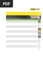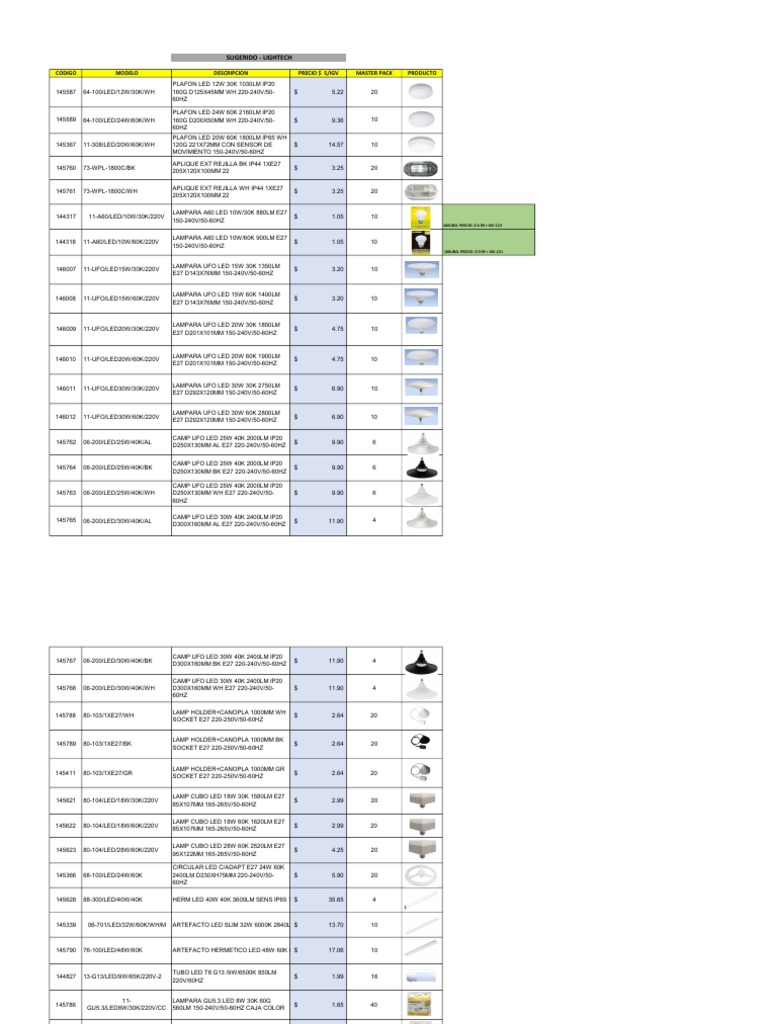 This document provides a list of lighting products including their codes, descriptions, prices, and packaging details. It includes various types of LED light fixtures and lamps such as ceiling lights, wall lights, floor lamps, bulbs, tubes, and decorative lights. The products are available in different wattages, light colors, and voltages to suit various residential and commercial lighting needs. Packaging ranges from individual pieces to bulk quantities for larger orders and installations.