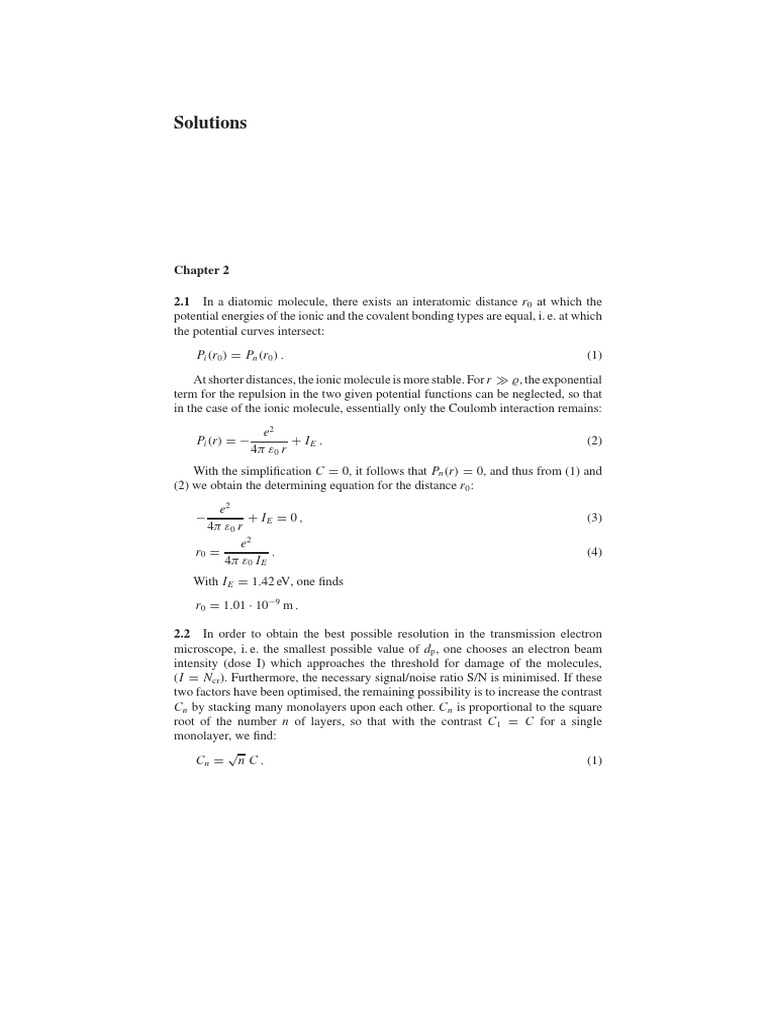 1) The document discusses potential energy curves for ionic and covalent bonding types in diatomic molecules, deriving an equation for the interatomic distance r0 at which the curves intersect. 2) It examines factors that influence the theoretical point resolution dp in transmission electron microscopes, deriving an equation to determine the number n of monolayers needed to achieve a given resolution. 3) Equations are presented relating the time-of-flight T of ionized molecules in a mass spectrometer to experimental variables like ion charge and accelerating voltage.