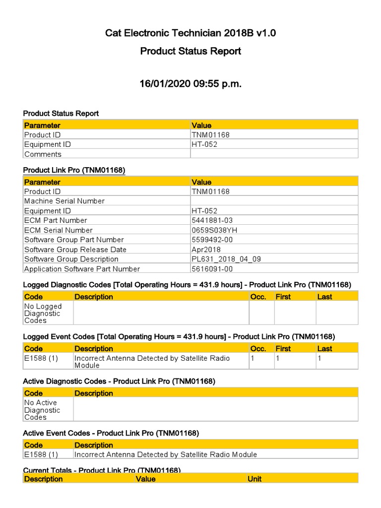 Logged Diagnostic Codes [Total Operating Hours = 431.9 hours] - Product Link Pro (TNM01168)
