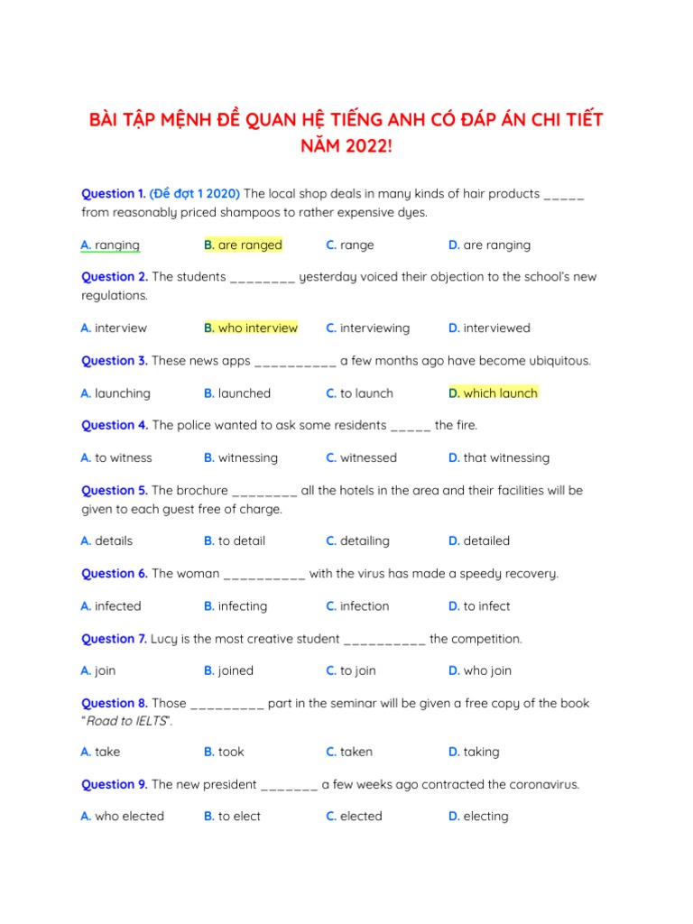 BÀI TẬP MỆNH ĐỀ QUAN HỆ TIẾNG ANH CÓ ĐÁP ÁN CHI TIẾT