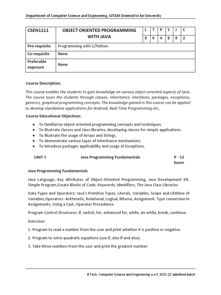 CSEN1111 OBJECT ORIENTED PROGRAMMING L T P S J C