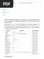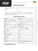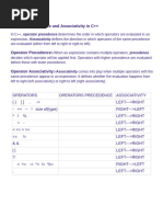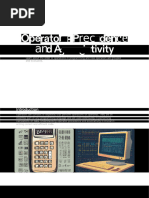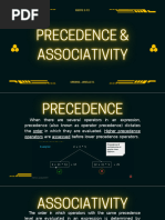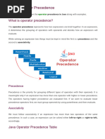 Operator precedence determines the order that operators are evaluated in an expression. Certain operators like multiplication have higher precedence than others like addition and are evaluated first. If operators have the same precedence, expressions are evaluated left to right or right to left according to the operator's associativity. An operator precedence table lists common operators from highest to lowest precedence to clarify evaluation order.