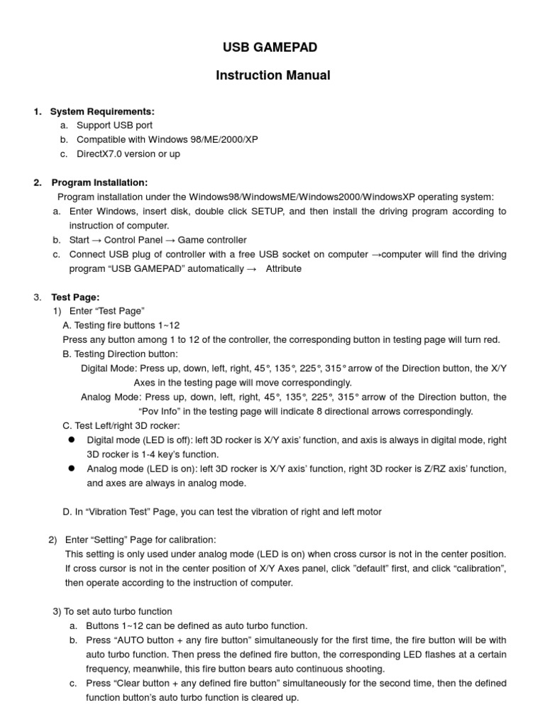 1. System Requirements: a. Support USB port b. Compatible with Windows 98/ME/2000/XP c. DirectX7.0 version or up 2. Program Installation: Program installation under the Windows98/WindowsME/Windows2000/WindowsXP operating system: a. Enter Windows, insert disk, double click SETUP, and then install the driving program according to instruction of computer. b. Start  Control Panel  Game controller c. Connect USB plug of controller with a free USB socket on computer computer will find the driving program USB GAMEPAD automatically  Attribute 3. Test Page: 1) Enter Test Page A. Testing fire buttons 1~12 Press any button among 1 to 12 of the controller, the corresponding button in testing page will turn red. B. Testing Direction button: Digital Mode: Press up, down, left, right, 45 135 225 315 arrow of the Direction button, the X/Y , , , Axes in the testing page will move correspondingly. Analog Mode: Press up, down, left, right, 45 135 225 315 arrow of the Direction button, the , , , Pov Info in the testing page will indicate 8 directional arrows correspondingly. C. Test Left/right 3D rocker: Digital mode (LED is off): left 3D rocker is X/Y axis function, and axis is always in digital mode, right 3D rocker is 1-4 keys function. Analog mode (LED is on): left 3D rocker is X/Y axis function, right 3D rocker is Z/RZ axis function, and axes are always in analog mode. D. In Vibration Test Page, you can test the vibration of right and left motor 2) Enter Setting Page for calibration: This setting is only used under analog mode (LED is on) when cross cursor is not in the center position. If cross cursor is not in the center position of X/Y Axes panel, click default first, and click calibration, then operate according to the instruction of computer. 3) To set auto turbo function a. Buttons 1~12 can be defined as auto turbo function. b. Press AUTO button + any fire button simultaneously for the first time, the fire button will be with auto turbo function. Then press the defined fire button, the corresponding LED flashes at a certain frequency, meanwhile, this fire button bears auto continuous shooting. c. Press Clear button + any defined fire button simultaneously for the second time, then the defined function buttons auto turbo function is cleared up.