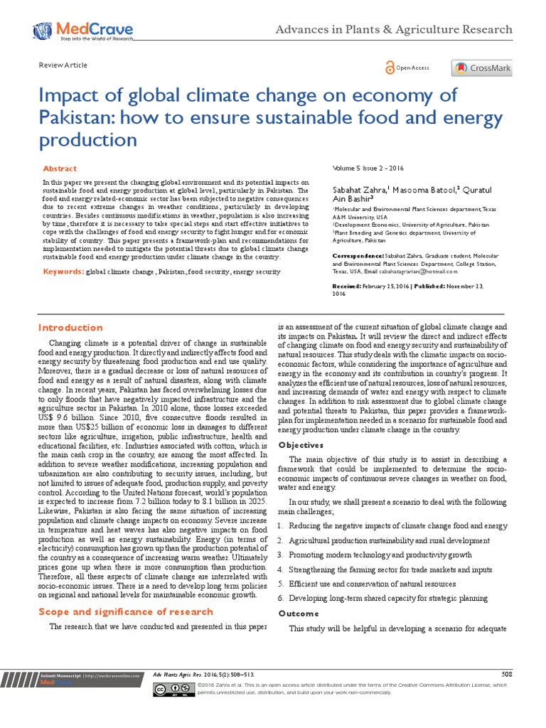 Citation: Zahra S, Batool M, Bashir QA. Impact of global climate change on economy of Pakistan: how to ensure sustainable food and energy production. Adv