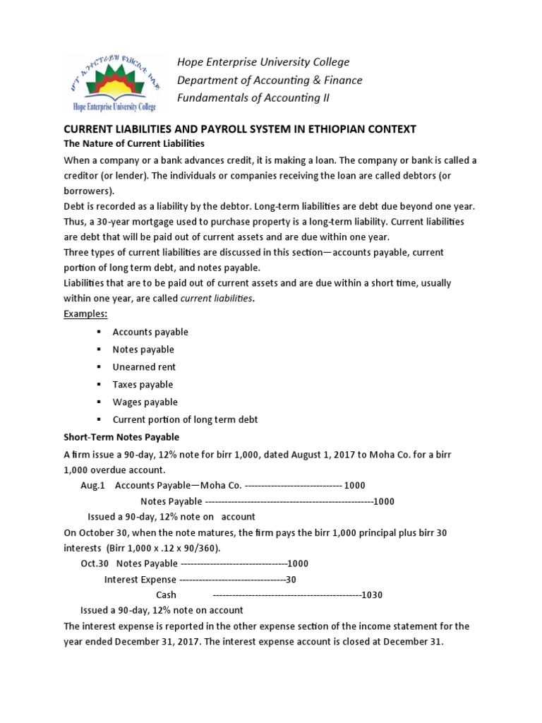 CURRENT LIABILITIES AND PAYROLL SYSTEM IN ETHIOPIAN CONTEXT