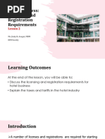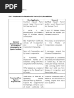 The document outlines the accreditation requirements set by the Department of Tourism (DOT) for different types of tourism and hospitality establishments in the Philippines. It lists the regular and premium accreditation requirements for hotels, resorts, apartment hotels, tourist inns, travel and tour agencies, tourist land transport operators, MICE organizers, MICE facilities/venues, and homestays. Requirements include valid permits and licenses, minimum insurance coverage amounts, certification and training of employees, financial capital amounts, and awards or recognition.
