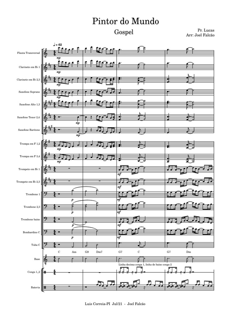 The document contains sheet music for a song arrangement. It displays musical notation across two pages, including parts for various instruments like flute, clarinet, saxophone, trumpet, trombone, and percussion.