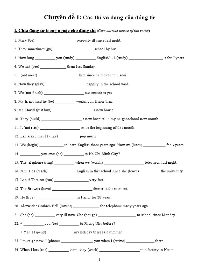 I. Chia động từ trong ngoặc cho đúng thì (Give correct tenses of the verbs)