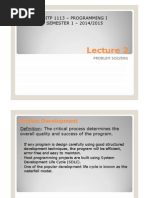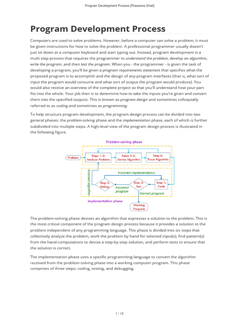 The document describes the program development process, which involves multiple steps to solve a problem and develop a computer program. It involves first understanding the problem, devising an algorithm to solve it through a problem-solving phase, and then implementing the algorithm into a program through coding, testing, and debugging during the implementation phase. As an example, it walks through solving the problem of calculating the distance between two points, including clearly defining the problem, describing the inputs and outputs, working through an example by hand, writing out precise step-by-step instructions, and generalizing the steps into a reusable algorithm. The key aspects are breaking the problem down into well-defined steps and being meticulous in writing out instructions a computer can follow precisely