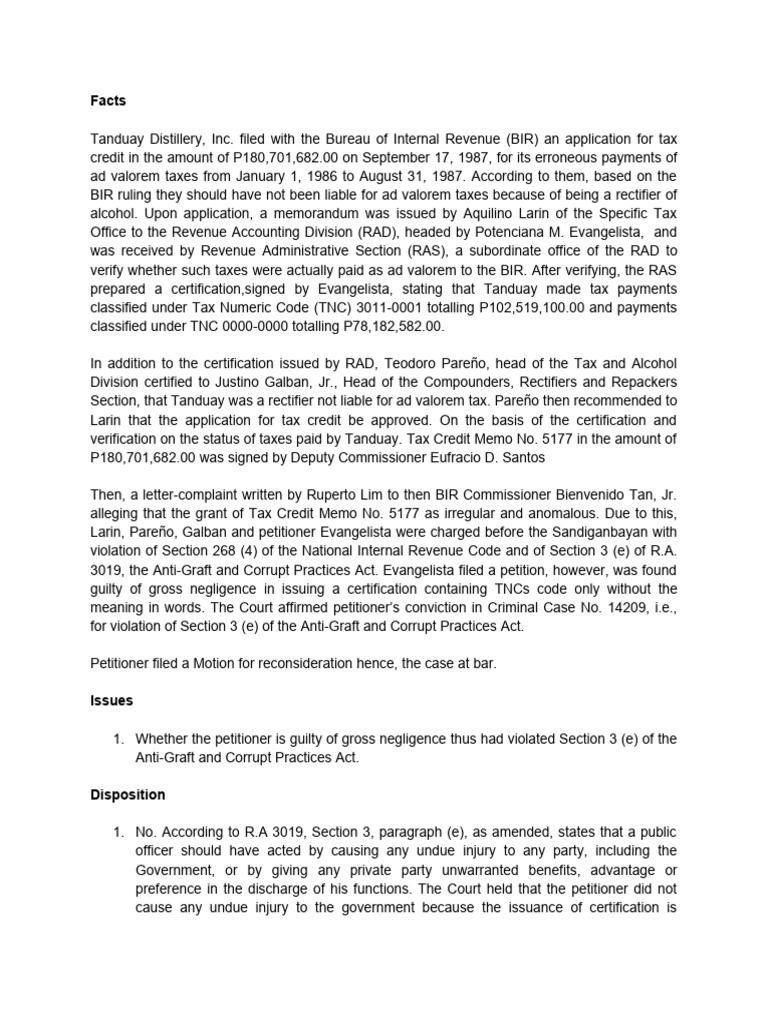 Tanduay Distillery filed for a tax credit of 180 million pesos for erroneously paying ad valorem taxes from 1986 to 1987. Potenciana Evangelista, head of the Revenue Accounting Division, issued a certification stating that Tanduay paid taxes under two tax codes but not for ad valorem taxes. However, Evangelista was charged with violation of the Anti-Graft act for gross negligence. The court found Evangelista not guilty, as the tax codes she included indicated that Tanduay did not pay ad valorem taxes, so she did not cause injury to the government or provide undue benefit. The court determined her actions did not violate the Anti-G
