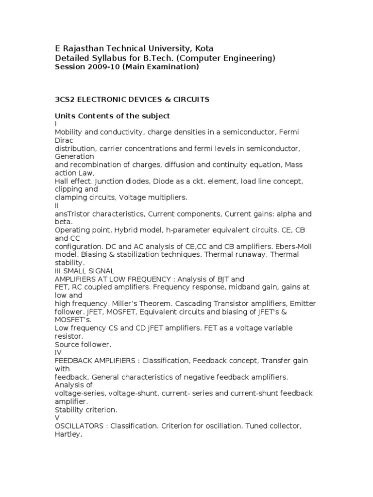 3CS2 ELECTRONIC DEVICES & CIRCUITS Units Contents of the subject I Mobility and conductivity, charge densities in a semiconductor, Fermi Dirac distribution, carrier concentrations and fermi levels in semiconductor, Generation and recombination of charges, diffusion and continuity equation, Mass action Law, Hall effect. Junction diodes, Diode as a ckt. element, load line concept, clipping and clamping circuits, Voltage multipliers. II ansTristor characteristics, Current components, Current gains: alpha and beta. Operating point. Hybrid model, h-parameter equivalent circuits. CE, CB and CC configuration. DC and AC analysis of CE,CC and CB amplifiers. Ebers-Moll model. Biasing & stabilization techniques. Thermal runaway, Thermal stability. III SMALL SIGNAL AMPLIFIERS AT LOW FREQUENCY : Analysis of BJT and FET, RC coupled amplifiers. Frequency response, midband gain, gains at low and high frequency. Millers Theorem. Cascading Transistor amplifiers, Emitter follower. JFET, MOSFET, Equivalent circuits and biasing of JFET's & MOSFETs. Low frequency CS and CD JFET amplifiers. FET as a voltage variable resistor. Source follower. IV FEEDBACK AMPLIFIERS : Classification, Feedback concept, Transfer gain with feedback, General characteristics of negative feedback amplifiers. Analysis of voltage-series, voltage-shunt, current- series and current-shunt feedback amplifier. Stability criterion. V OSCILLATORS : Classification. Criterion for oscillation. Tuned collector, Hartley,