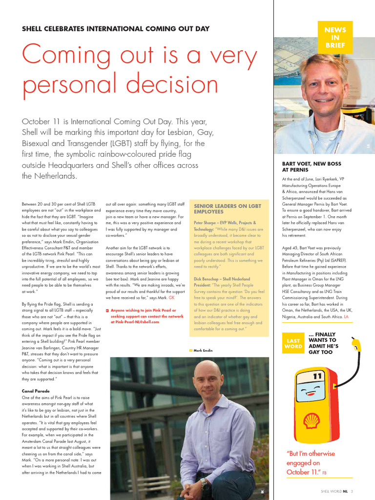 Shell celebrated International Coming Out Day by flying the rainbow pride flag at its headquarters and other Dutch offices for the first time. This sent a signal to LGBT staff, especially those not "out", that Shell supports people in coming out. Only 20-30% of LGBT Shell employees are openly out. Pink Pearl, Shell's LGBT network, aims to encourage more staff to come out and senior leaders to discuss being gay or lesbian. Their efforts have raised awareness among leaders. The pride flag display and network support people to be themselves at work.