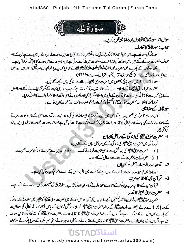 The document discusses the 9th Tarjuma Tul Quran of Surah Taha by Ustad360 in Punjab. It provides the translation and commentary of Surah Taha in 10 parts for students to study Quran. It directs readers to the website ustad360.com for additional Islamic learning resources.