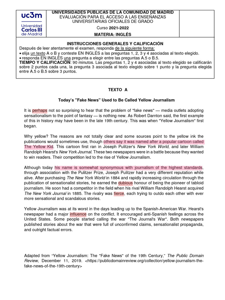 (Puntuación máxima: 2 puntos) a) In 1885, Pulitzer and Hearst, started a race to win costumers by posting fake news
