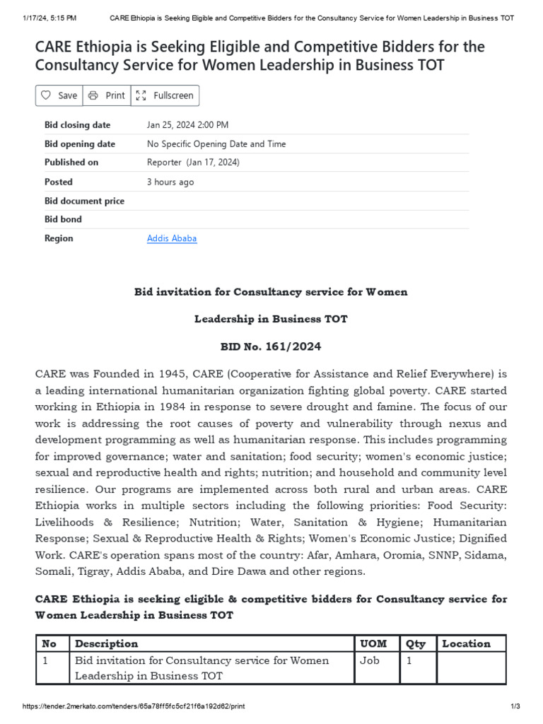 1/17/24, 5:15 PM CARE Ethiopia is Seeking Eligible and Competitive Bidders for the Consultancy Service for Women Leadership in Business TOT