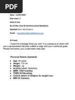 This document outlines a 7-day diet plan with meal timings and food items for each meal. The diet includes a variety of foods like dosas, poha, uttapam, sabudana, soups, salads, lentils, eggs, fish and includes snacks and herbal drinks. Meals incorporate different cooking methods like steaming, roasting and include ingredients like raisins, pomegranate, makhana, quinoa and gluten-free options. Snacks are included in the evenings and nights. The plan emphasizes starting meals with salads and drinking fennel or ginger water after meals and before sleep along with 10 minutes of meditation.