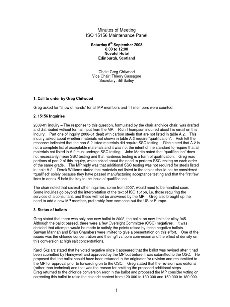 The minutes summarized a meeting of the ISO 15156 Maintenance Panel held on September 6, 2008 in Edinburgh, Scotland. Key discussion points included: 1) Addressing inquiries related to the standard, including questions about material qualification requirements. 2) The status of ballots, including a proposed correction to chloride concentration limits. A task group was formed to address issues with chloride conversions and other errors. 3) Presentations made regarding testing duration requirements for nickel alloys in the standard. There was debate around appropriate test durations but no resolution. 4) The status of an action item around allowable cold work levels in austenitic stainless steels, where further discussion and testing results were deemed necessary before