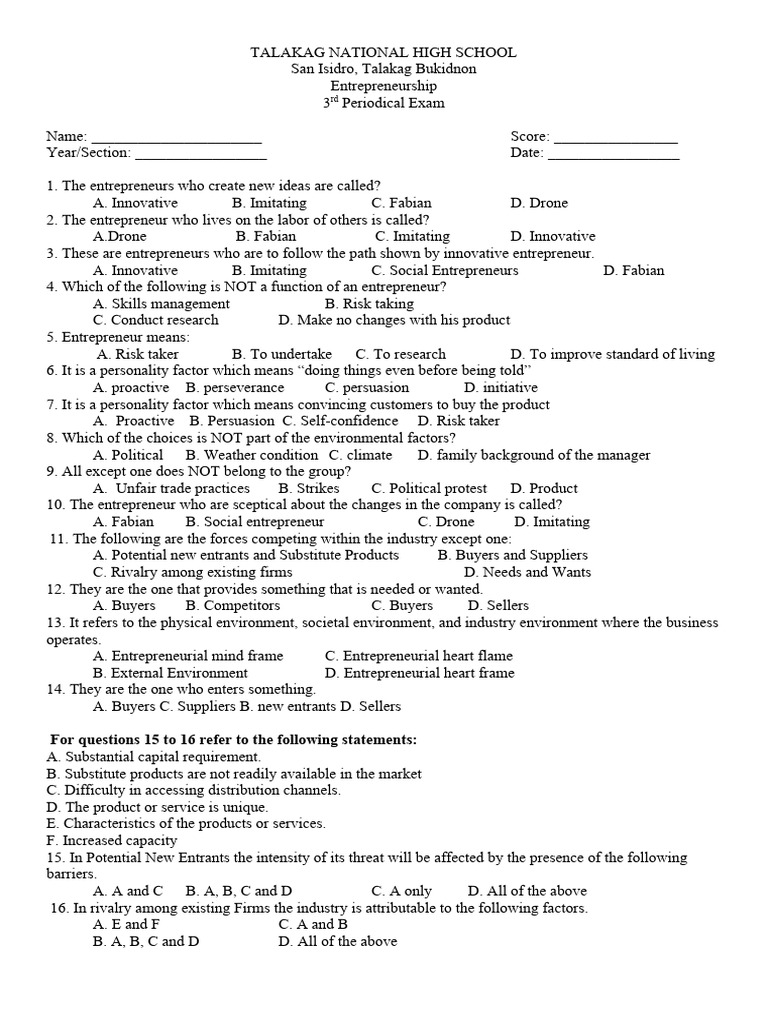 This document appears to be a test on entrepreneurship consisting of multiple choice questions. It covers topics like the different types of entrepreneurs, characteristics of entrepreneurs, factors that affect businesses like the external environment and industry environment, and key entrepreneurship concepts like marketing, market research, and the marketing mix. The test is for a 3rd periodical exam at Talakag National High School in the Philippines.