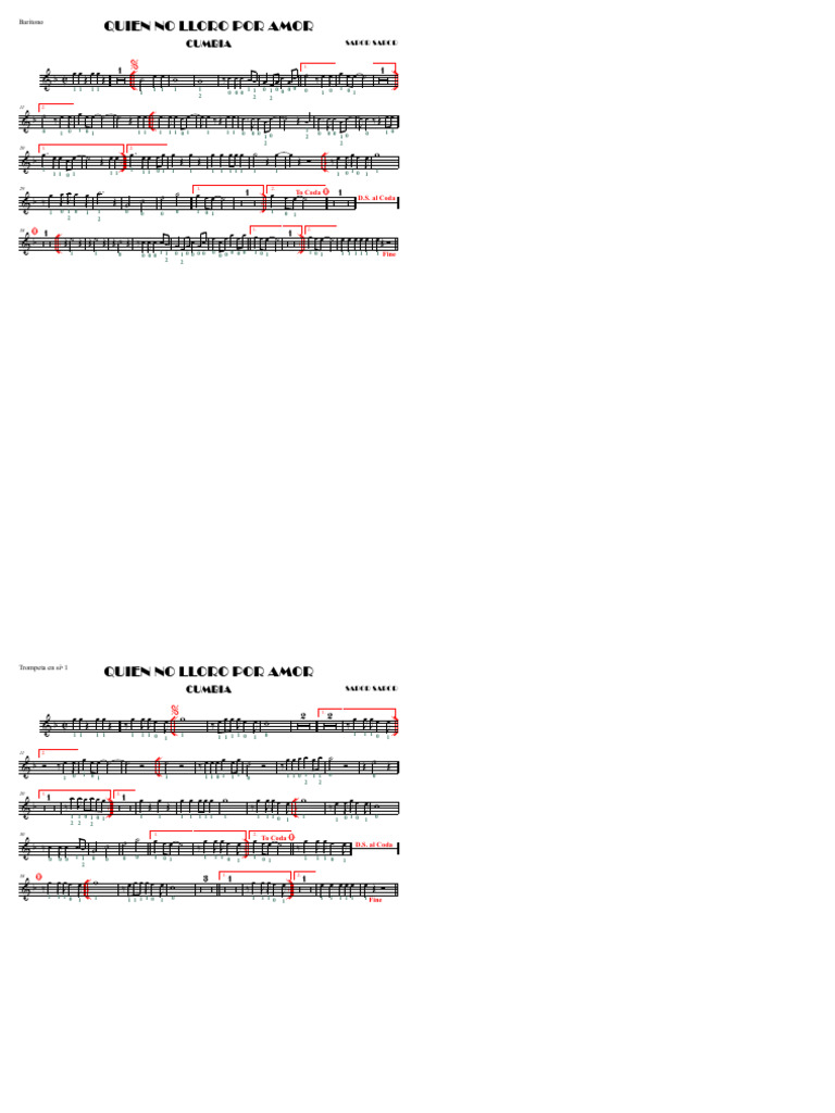 This musical composition is titled "Quien No Lloro Por Amor" or "Who Didn't Cry For Love". It is written in the style of a cumbia with lyrics about the pain of heartbreak. The sheet music contains the melody written in musical notation for multiple instruments including baritone, trumpet, and trompeta. It follows a typical cumbia structure with introductions, verses, choruses, and codas across several pages of sheet music.