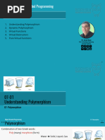 Polymorphism allows objects to take on multiple forms. In object-oriented programming, polymorphism means that derived classes can override methods from their base classes. There are two types of polymorphism: static polymorphism (or early binding), which occurs at compile time via function overloading, and dynamic polymorphism (or late binding), which occurs at runtime via virtual functions. With virtual functions, the decision of which function to call is determined by the actual object type, not the reference type, allowing base class pointers or references to transparently call derived class functions.