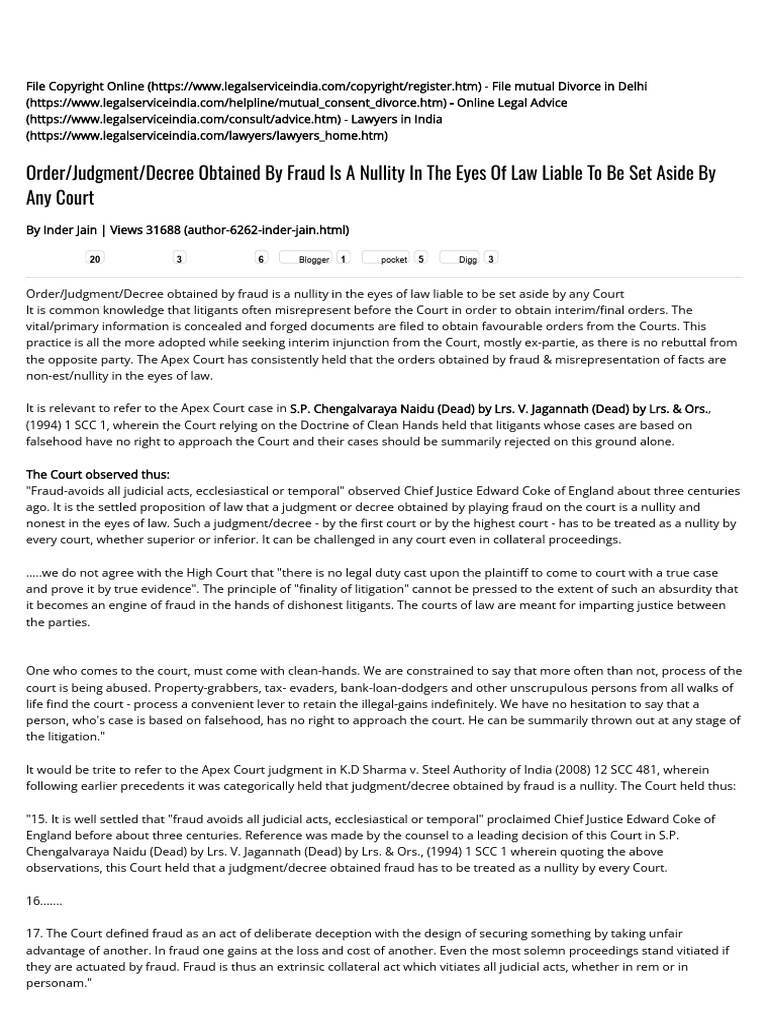 25....... Fraud vitiates all solemn acts. When an order has been obtained by practising fraud on the court, it would be a nullity.