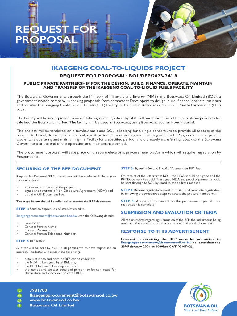 and transfer the Ikaegeng Coal-to-Liquid Fuels (CTL) Facility, to be built in Botswana on a Public Private Partnership (PPP)