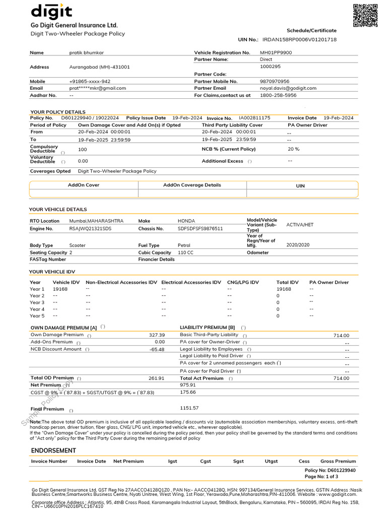 Policy No. D601229940 / 19022024 Policy Issue Date 19-Feb-2024 Invoice No. IA002811175 Invoice Date 19-Feb-2024