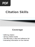 The document provides information about citing sources in papers. It discusses what types of sources can be cited, including books, magazines, newspapers, films and online materials. It also reviews different citation styles like APA, MLA, Chicago and Turabian. The document explains that there are two types of citations - in-text citations which are included within the body of the paper, and reference citations which are full bibliographic information listed at the end. It provides examples of how to format in-text and reference citations in APA, MLA and Chicago styles.