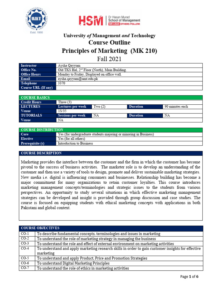 CLO-1 To describe fundamental concepts, terminologies and issues in marketing.