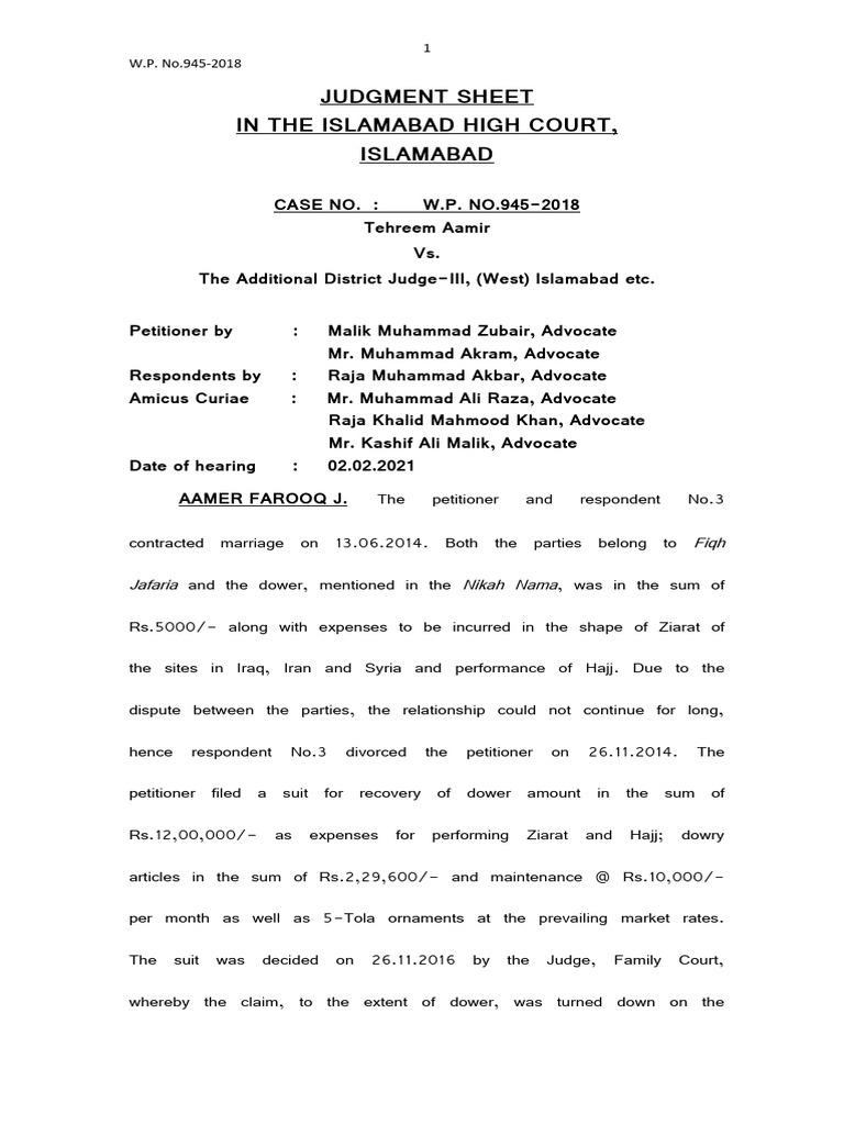 concept of ‘dower’ in case reported as ‘Saadia Usman and another Vs.