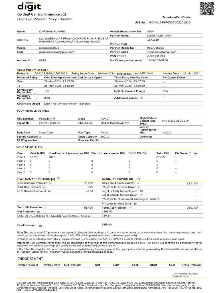 Policy No. D142033866 / 29032024 Policy Issue Date 29-Mar-2024 Invoice No. IA129501940 Invoice Date 29-Mar-2024