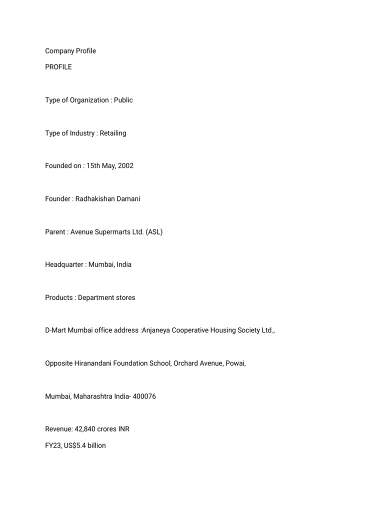 Strong Market Presence: DMart has a significant presence in the retail industry, with numerous
