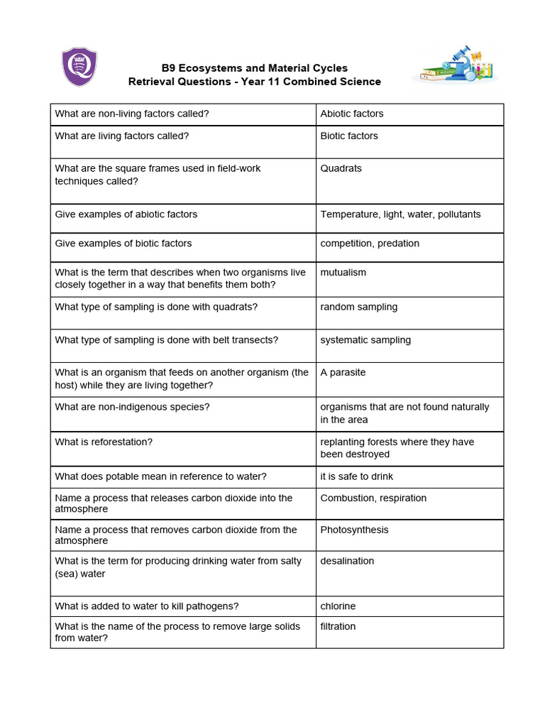 Retrieval Questions - Year 11 Combined Science