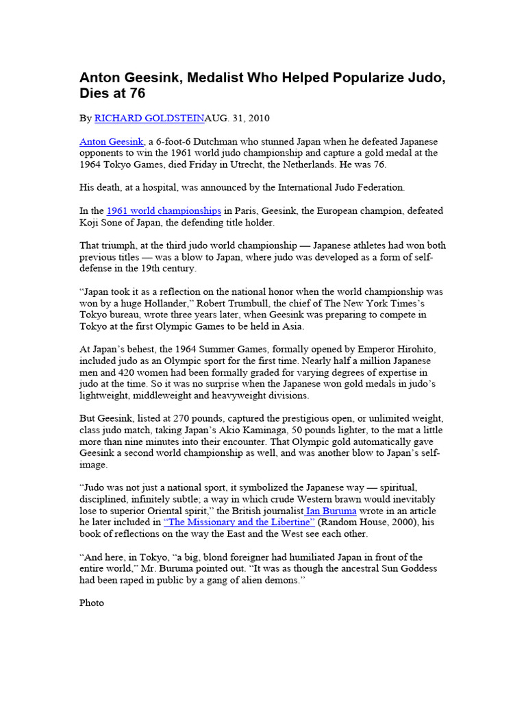 7. Goldstein, Richard (August 31, 2010). "Anton Geesink, Medalist Who