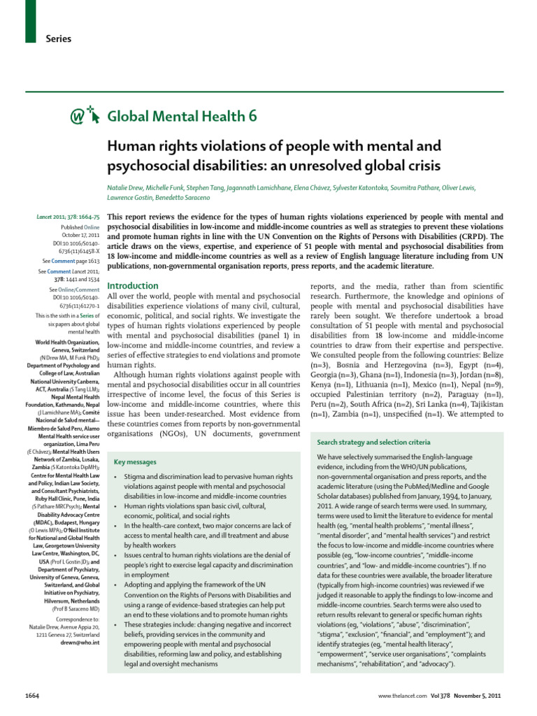 Lancet 2011; 378: 1664–75 This report reviews the evidence for the types of human rights violations experienced by people with mental and