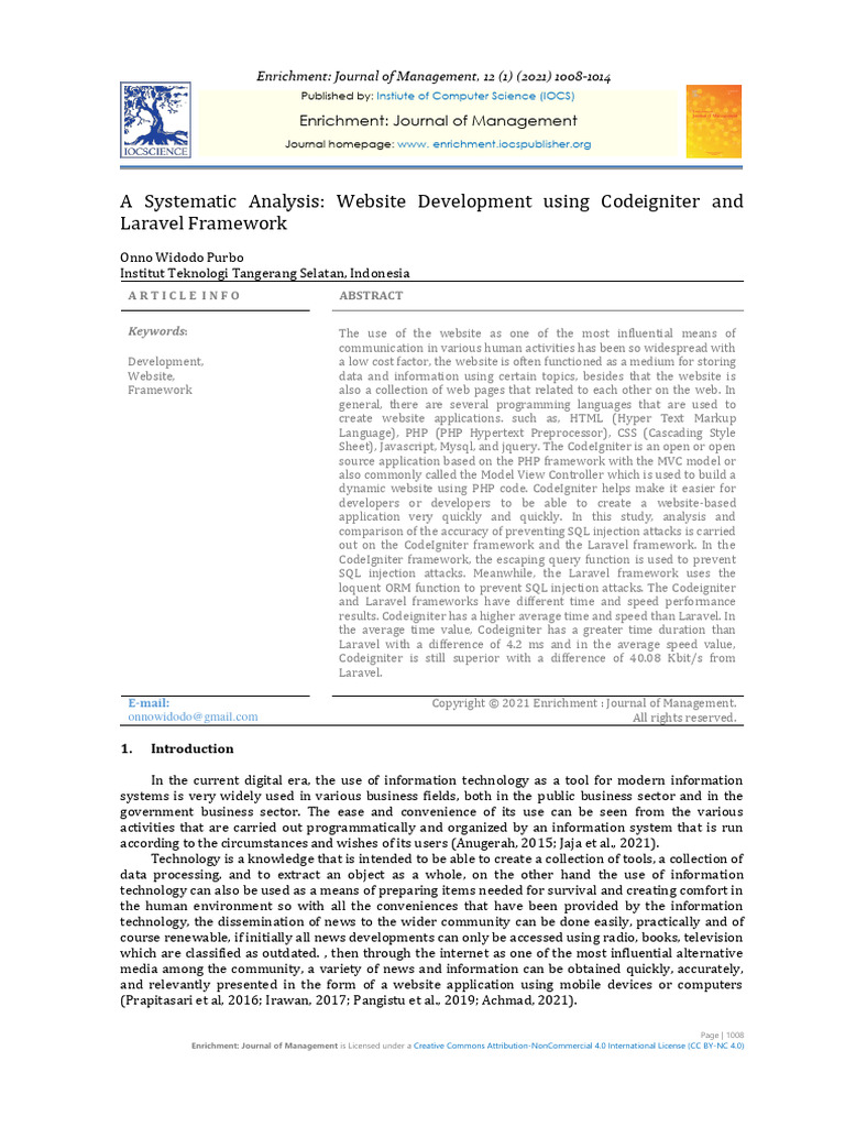 2018; Purbo, 2021). CodeIgniter is also one of the preferred frameworks that allows developers to