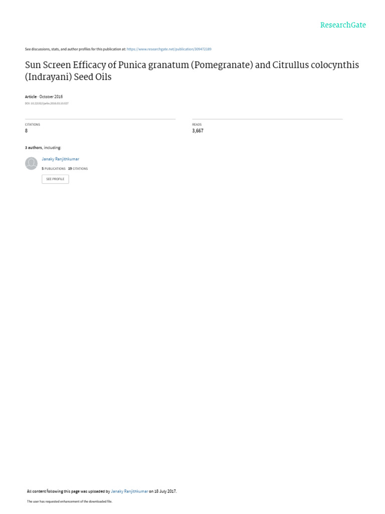 Janaky Ranjithkumar, Akhila Sameesh, Hari Ramakrishnan, K. (2016). Sun Screen Efficacy of Punica