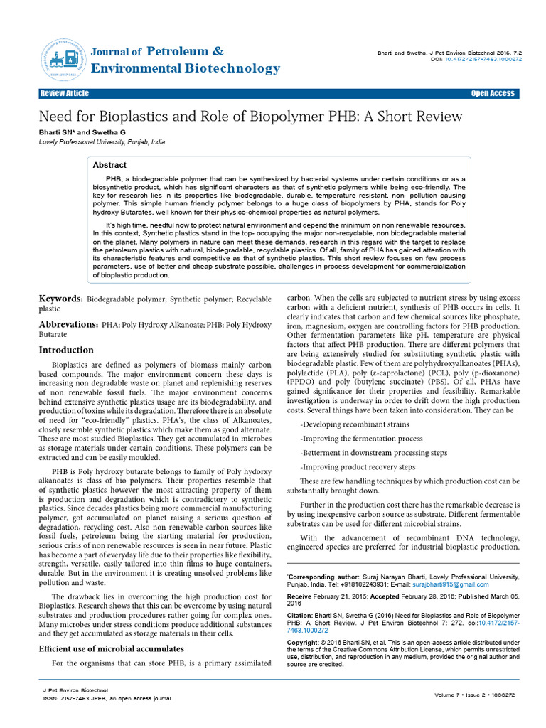 Citation: Bharti SN, Swetha G (2016) Need for Bioplastics and Role of Biopolymer PHB: A Short Review. J Pet Environ Biotechnol 7: 272.