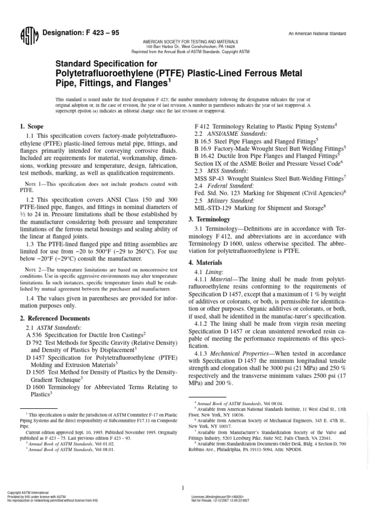 Astm F423 1995 Spec. Polytetrafluroethylene (Ptfe) Plastic