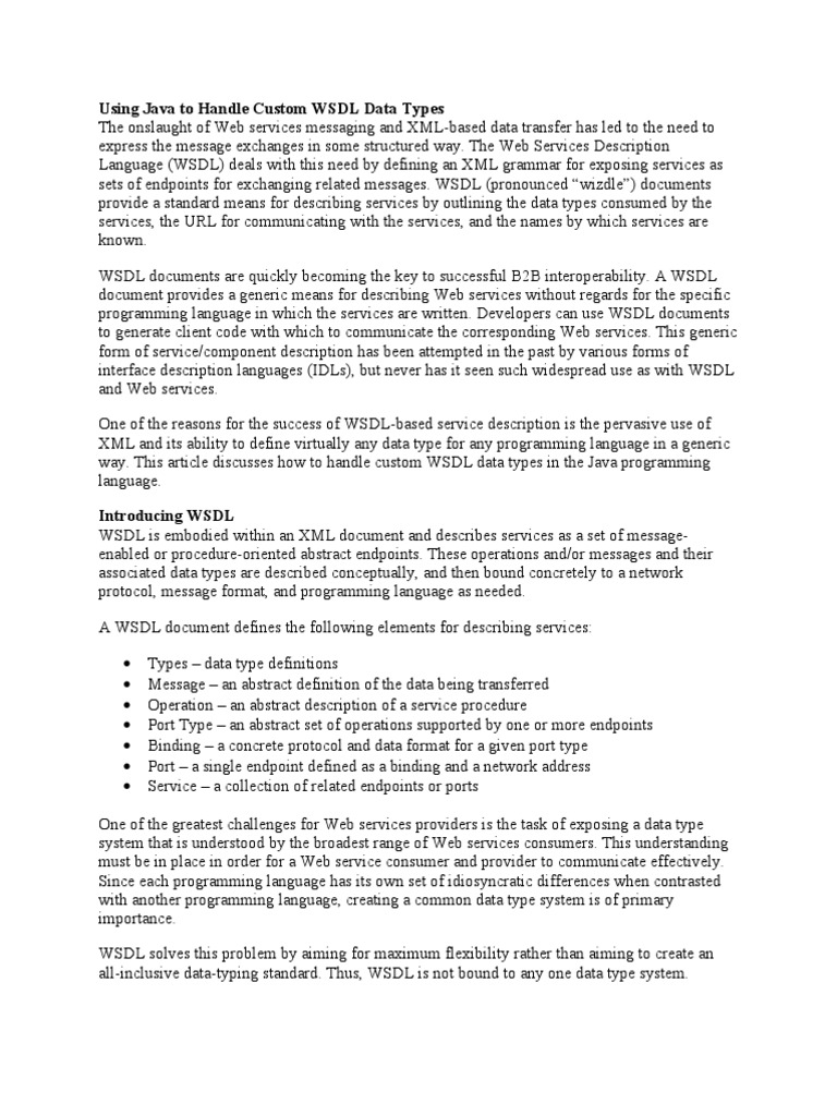 Using Java to Handle Custom WSDL Data Types The onslaught of Web services messaging and XML-based data