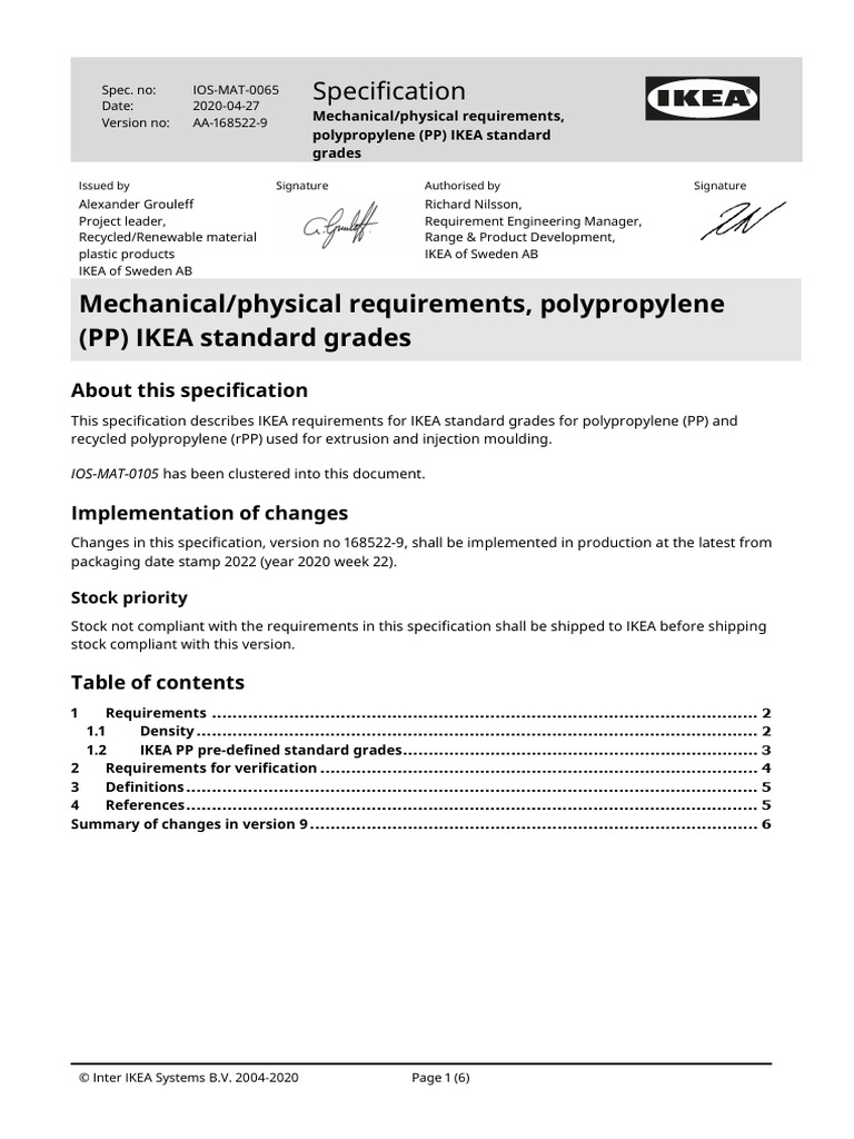 This specification describes IKEA requirements for IKEA standard grades for polypropylene (PP) and
