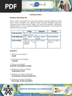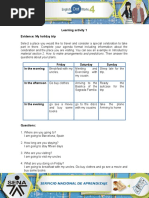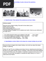 The document provides an exercise for B1 level English students to practice travel vocabulary, speaking, and writing skills by planning a vacation. It includes matching vocabulary definitions, reading comprehension questions about a sample vacation plan to Italy, role playing activities as a travel agent and customer, and writing a short paragraph about one's own dream vacation.
