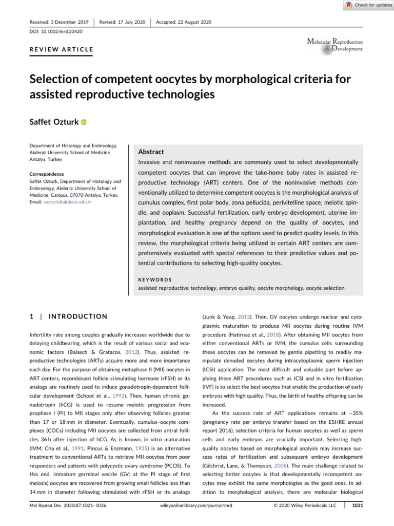 Molecular Reproduction Devel - 2020 - Ozturk - Selection of Competent Oocytes by Morphological Criteria For Assisted