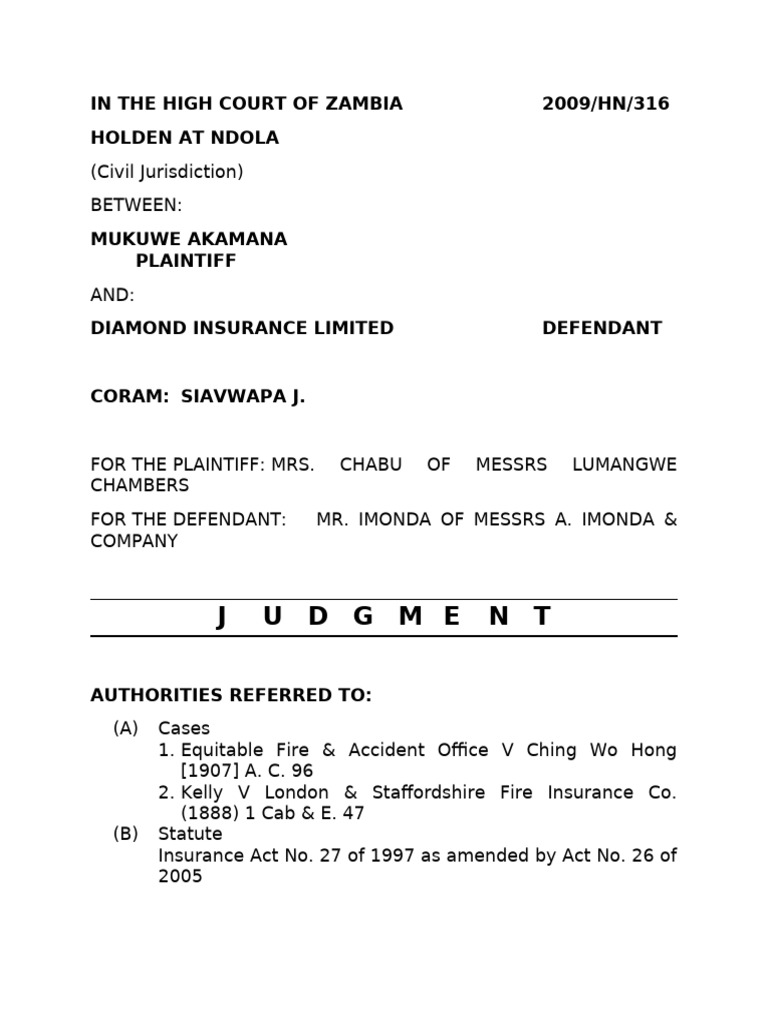 Akamana V Diamond Insurance LTD (HN 316 of 2009) 2011 ZMHC 47 (31 May 2011)