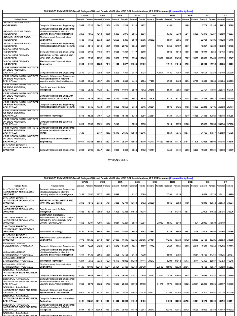 TS EAMCET ENGINEERING Top 40 Colleges OU Local Cutoffs - 2023 (For CSE, CSE Specialisations, IT & ECE Courses) - Updated