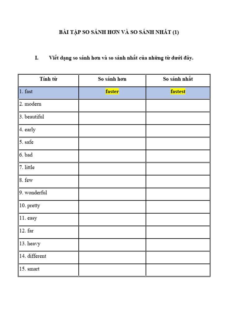 I. Viết dạng so sánh hơn và so sánh nhất của những từ dưới đây.