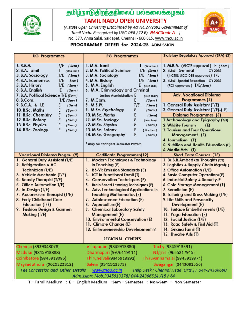1. B.B.A. T/E ( Sem ) 1. M.A. Tamil T ( Non Sem ) 1. M.B.A. (AICTE approval ) E ( Sem )
