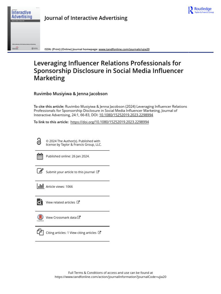 To cite this article: Ruvimbo Musiyiwa & Jenna Jacobson (2024) Leveraging Influencer Relations