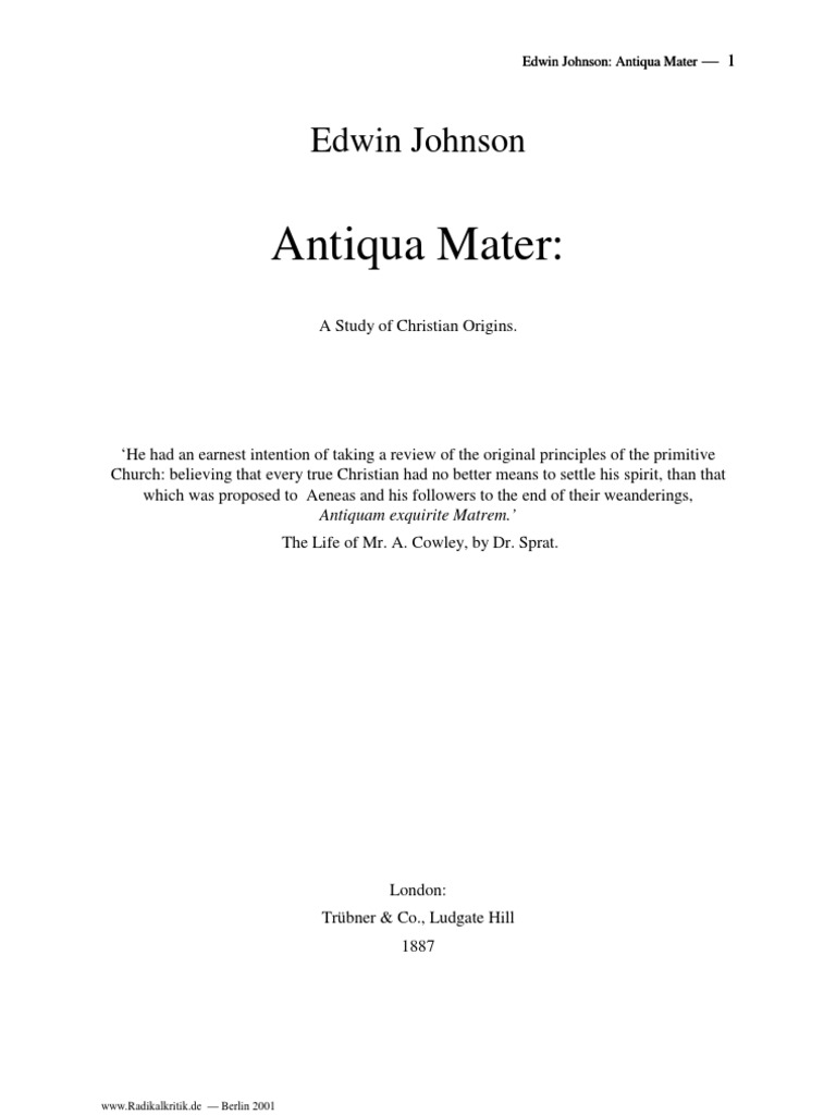 He had an earnest intention of taking a review of the original principles of the primitive Church: believing that every true Christian had no better means to settle his spirit, than that which was proposed to Aeneas and his followers to the end of their weanderings, Antiquam exquirite Matrem. The Life of Mr. A. Cowley, by Dr. Sprat.